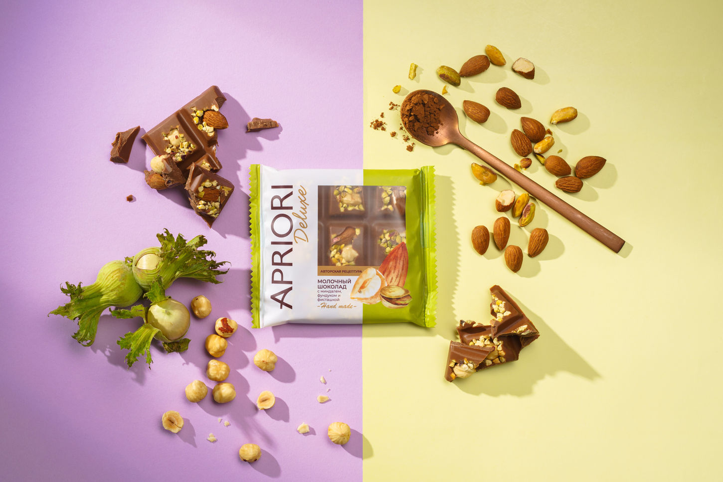 После обновления бренда Apriori, компания выпустила новую линейку мини-плиток Apriori Deluxe — яркие вкусы, созданные для быстрого удовольствия. Наша задача состояла в том, чтобы продолжить визуальную стратегию бренда, но перевести её в более компактную форму.